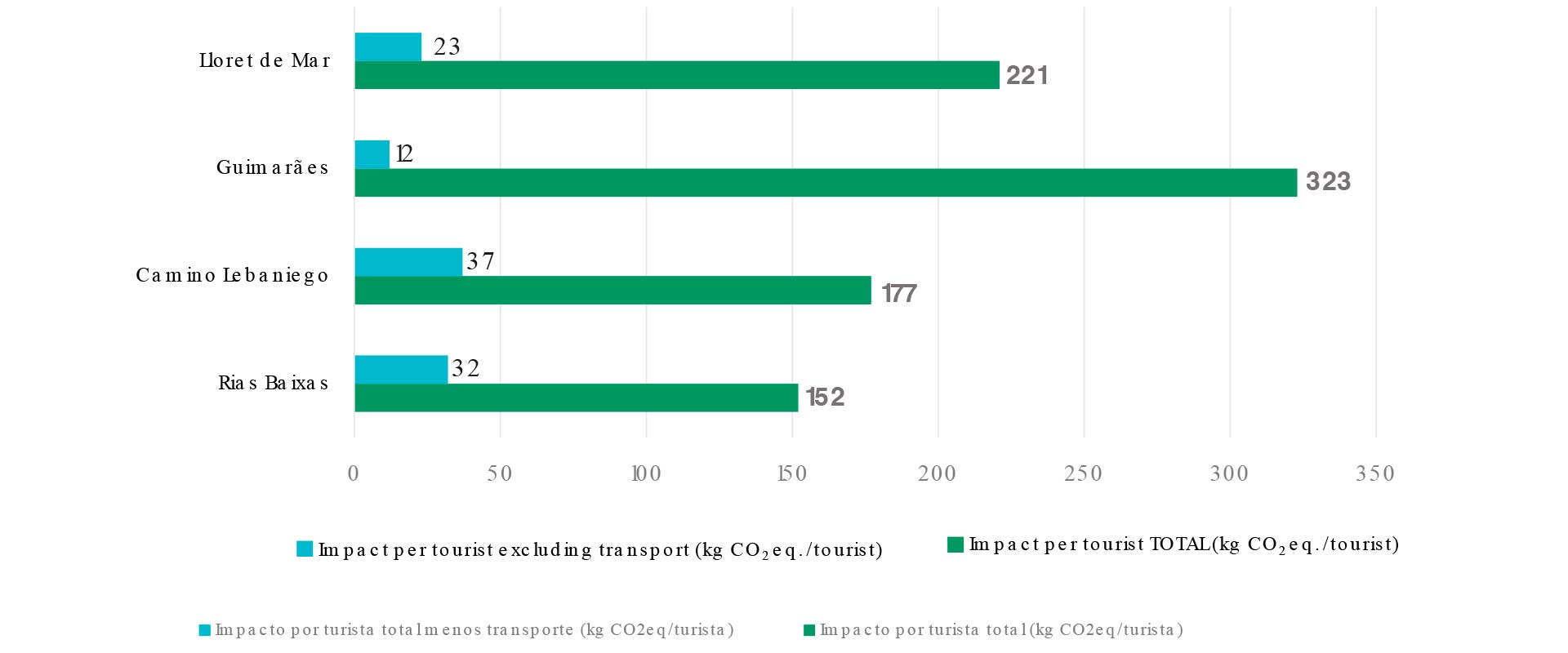 The tool’s results showed clear differences between destinations: Rías Baixas had the lowest average carbon footprint per tourist (152 kg CO₂ eq.), while Guimarães had the highest (323 kg CO₂ eq.), due to the nature of their tourism offerings. Electricity consumption and high-impact foods like red meat and dairy were also identified as critical impact areas.
